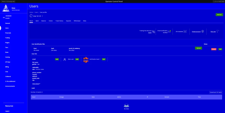 Operator controls 允许您完全控制您的交易及其数据,例如在Users中,您将能够看到有关您的交易用户的一般信息以及他们的地位或验证状态等信息。