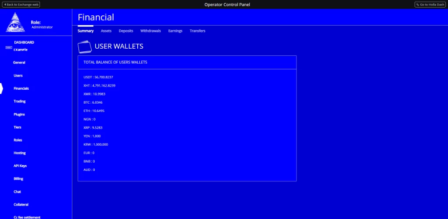 它们还使您可以访问交易的所有数据,例如,在“Financials”中,您可以查看交易的资产,以及用户的提款、存款、钱包和更多一般信息。 您也可以和您的交易对象之间转账加密货币。