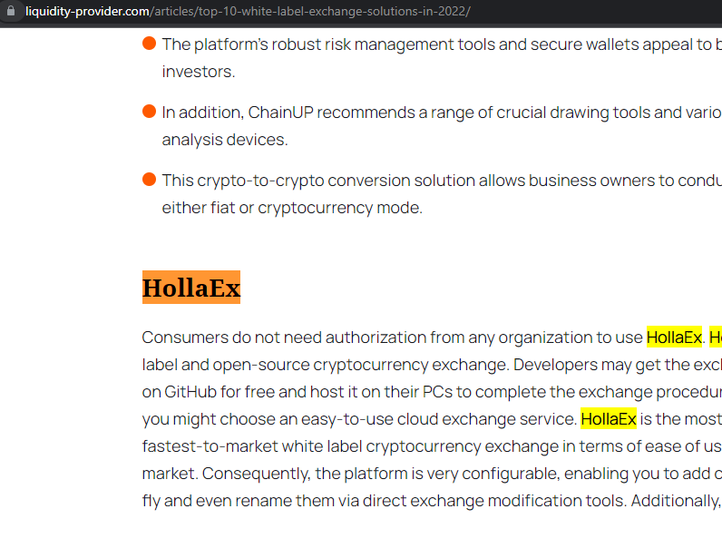 HollaEx is among the top 10 white label exchange solutions in 2022! Mentioned in the article here: https://liquidity-provider.com/articles/top-10-white-label-exchange-solutions-in-2022/